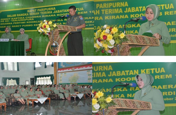 Persit Kartika Chandra Kirana Koorcab Rem 102 PD XII/Tpr melaksanakan kegiatan Rapat Paripurna dalam rangka serah terima jabatan Ketua Persit Katika Chandra Kirana Koorcab Rem 102 PD XII/Tpr dari Ny. Nency Purwo Sudaryanto kepada Ny. Rika Naudi Nurdika yang bertempat di Aula Makorem 102/Pjg pada selasa (11/10) pukul 10.00 Wib , diikuti kurang lebih seratus ibu-ibu Persit dari seluruh Cabang jajaran Korem 102/Pjg. Turut hadir sebagai Pembina Harian Persit KCK Koorcab Rem 102/Pjg Letnan Kolonel Kav Handyansyah. SE Jabatan Kasi Pers Korem 102/Pjg..
