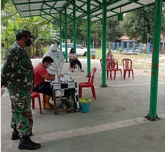 BARTIM – Petugas Puskesmas Edison Jaar didampingi Babinsa Koramil 04/Tamiang Layang Serda Rodiansyah dan perangkat desa melakukan tracing dan swab antigen kepada keluarga dan tetangga pasien Covid-19 di Desa Jaar, Kecamatan Dusun timur. Pasien terkonfirmasi Covid-19 di Desa Edison Jaar saat ini sedang melakukan isolasi mandiri dengan pengawasan Satgas Covid desa dan Puskesmas Edison Jaar.