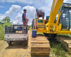 Guna mendukung kelancaran alat berat excavator membangun jalan, Satgas TMMD Ke-124 Kodim 1012/Buntok melakukan penyuplaian dan pengisian bahan bakar solar alat berat, Bertempat di Jalan Desa Talio, Kecamatan Karau Kuala, Kabupaten Barito Selatan, Pada hari Jumat (09/05/2025